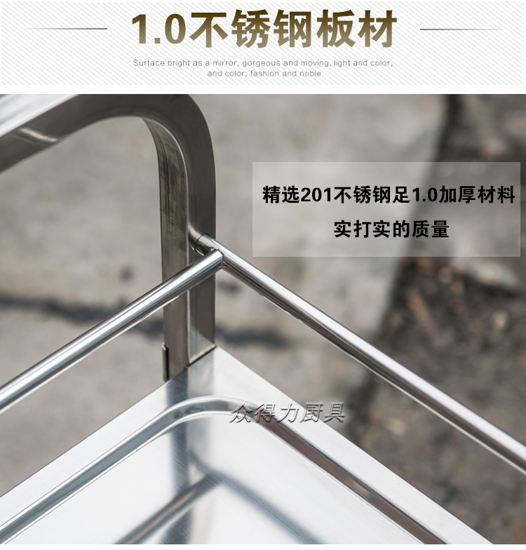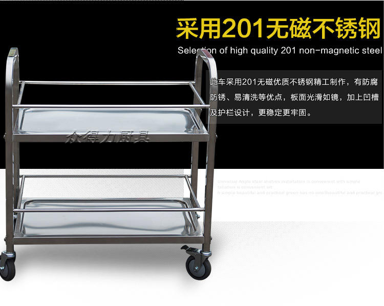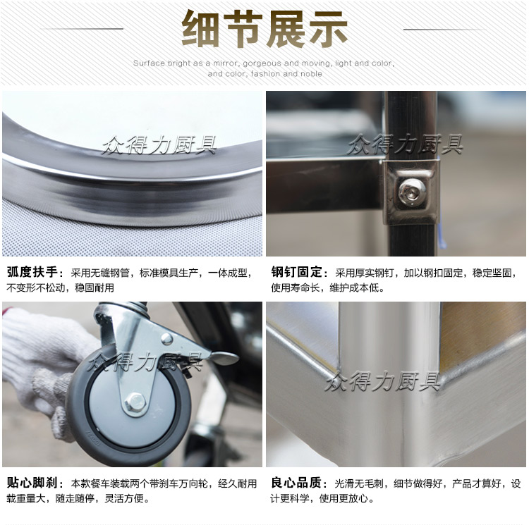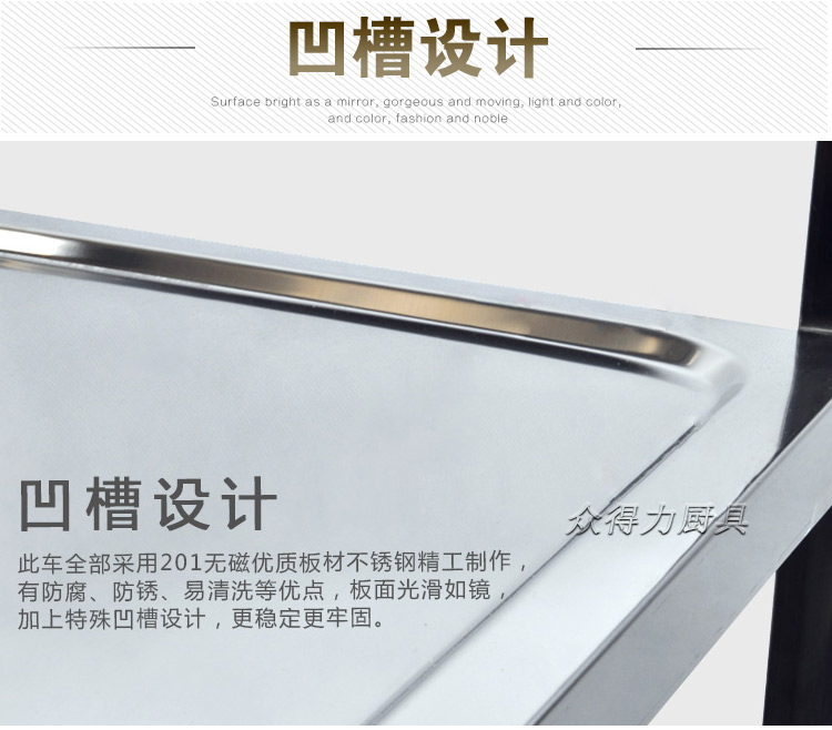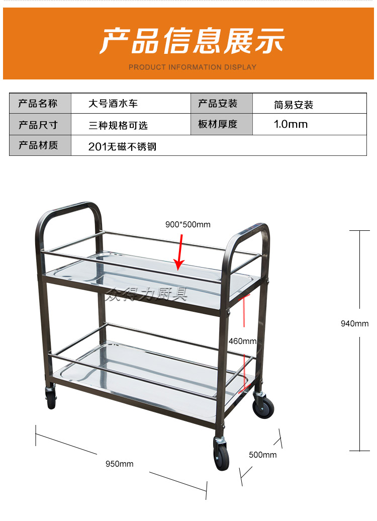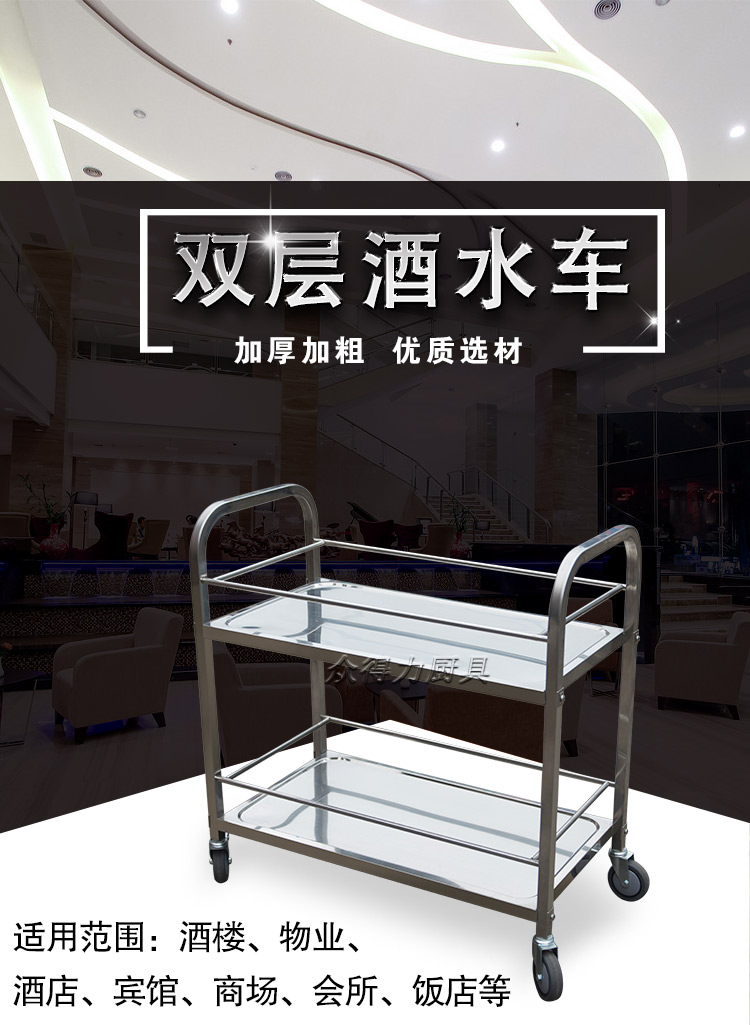 江西眾得力廚具有限公司生產(chǎn)銷售食品機(jī)械,商用廚具系列中央廚房設(shè)備,為客戶提供廚房整體解決方案。我司生產(chǎn)銷售的酒水車有大、中、小三種規(guī)格,采用201無磁不銹鋼設(shè)計(jì)。外形美觀大方,結(jié)實(shí)耐用。深受餐飲酒店客戶青睞