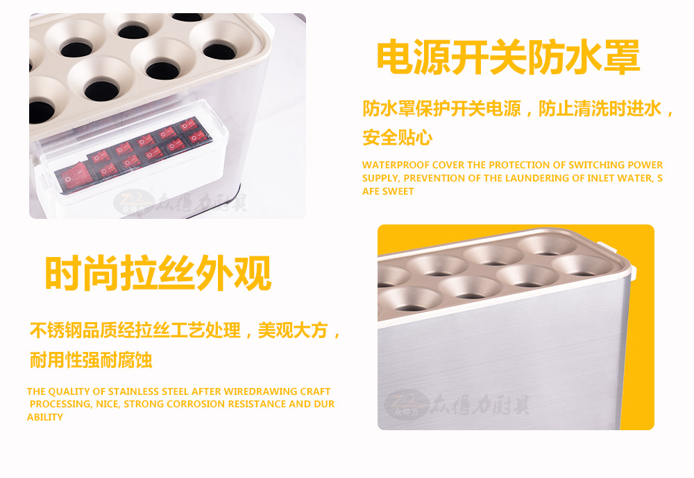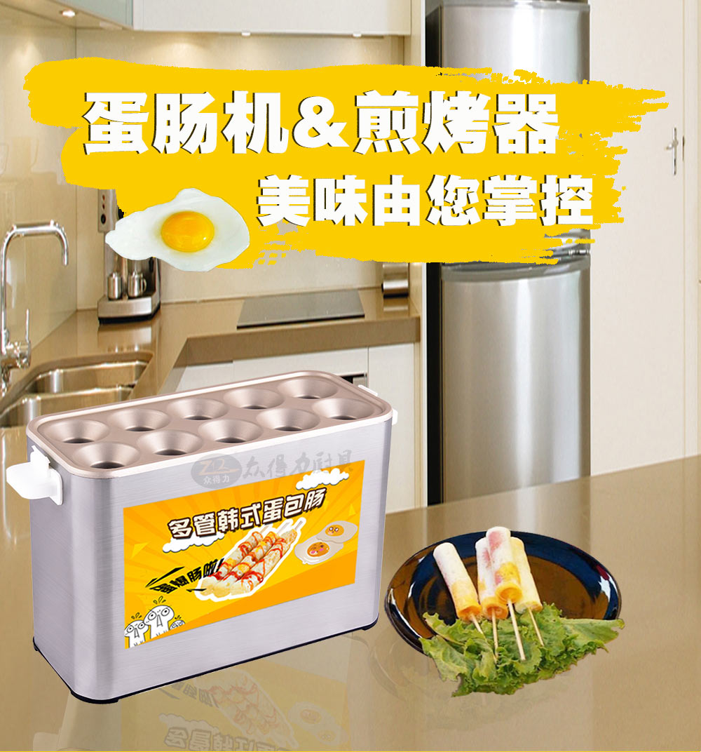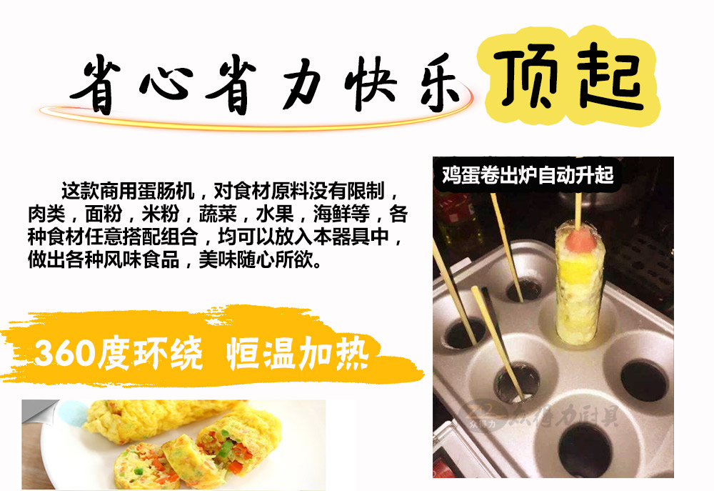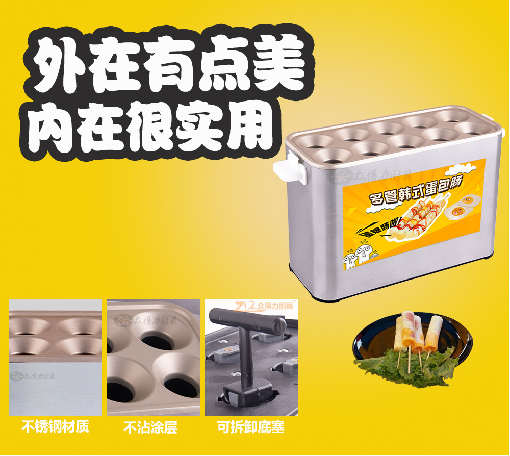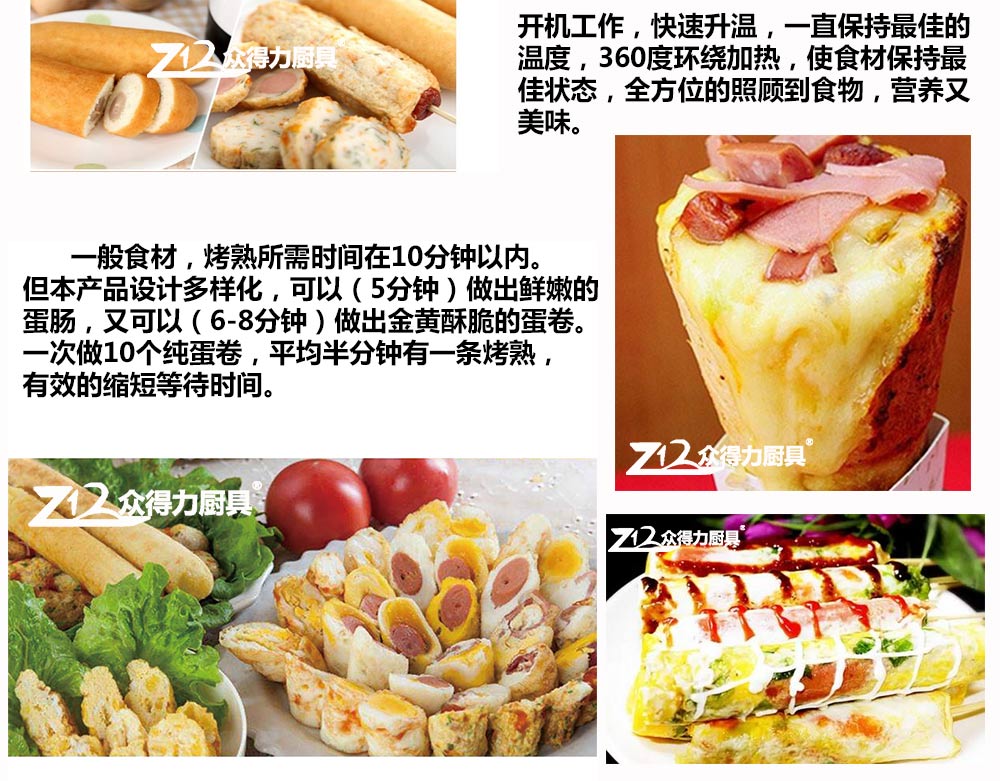 燃?xì)獾澳c機(jī),電熱蛋腸機(jī),快速升溫,360度環(huán)繞加熱,5分鐘即可做出鮮嫩的蛋腸,一次做十個蛋卷,平均每半分鐘即可烤熟一根,有效縮短等待時間,提高產(chǎn)品銷售額,蛋腸蛋卷美味吸引過往人群,小吃致富首選小設(shè)備,操作簡單。眾得力廚具,給我一個空間,服務(wù)一輩子。