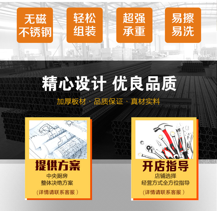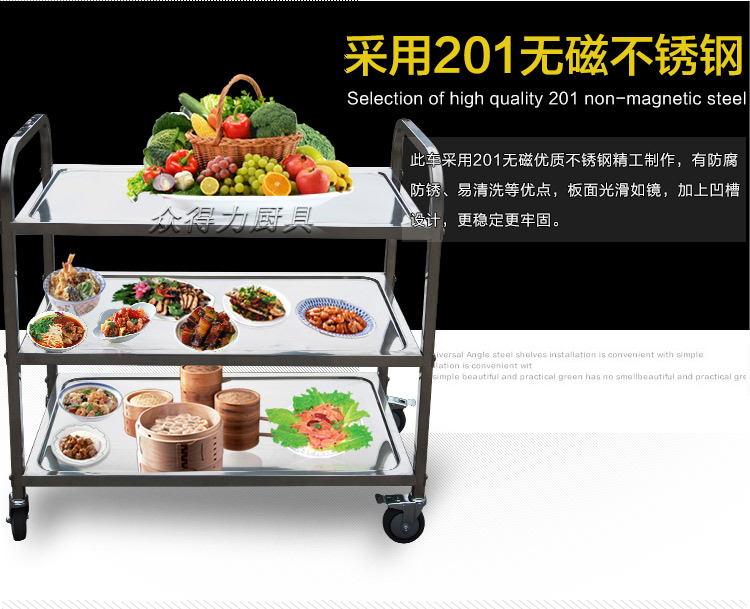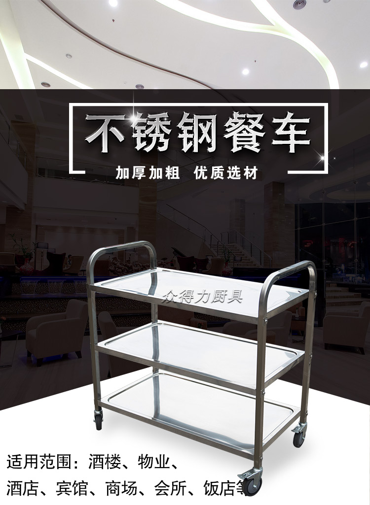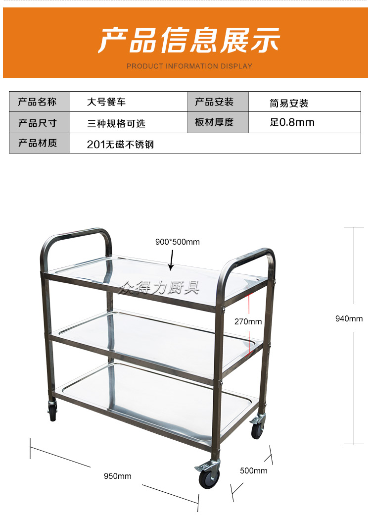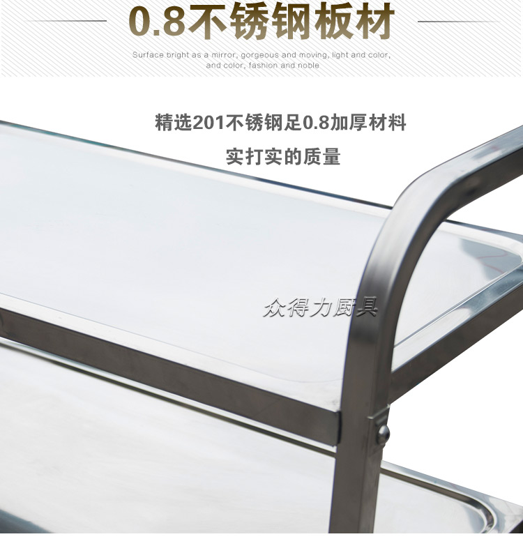 江西眾得力廚具有限公司生產(chǎn)銷售商用廚具,食品機(jī)械,提供中央廚房工程項目整體解決方案。不銹鋼餐車有大號、中號、小號,本公司生產(chǎn)銷售的不銹鋼餐車系列均采用201無磁不銹鋼材質(zhì),板材厚度足0.8mm,整機(jī)拆裝方便,結(jié)構(gòu)牢固,承重能力強。