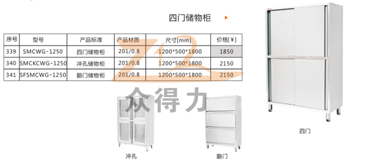 江西眾得力廚具有限公司生產(chǎn)銷售食品機械和商用廚具系列設(shè)備,為您提供中央廚房整體解決方案。本產(chǎn)品為四門儲物柜系列,有沖孔、翻門 四門之分,均為四層儲物柜系列。