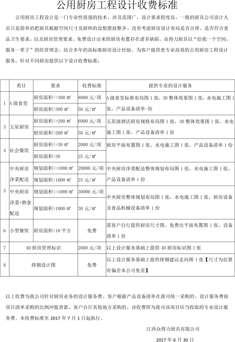 以上設(shè)計(jì)收費(fèi),客戶可自行其他公司統(tǒng)一采購,凡廚房設(shè)備清單在我公司一站式采購的,設(shè)計(jì)服務(wù)費(fèi)可按比例抵扣貨款。在我司一站式采購廚房設(shè)備,即免以上設(shè)計(jì)服務(wù)費(fèi)。